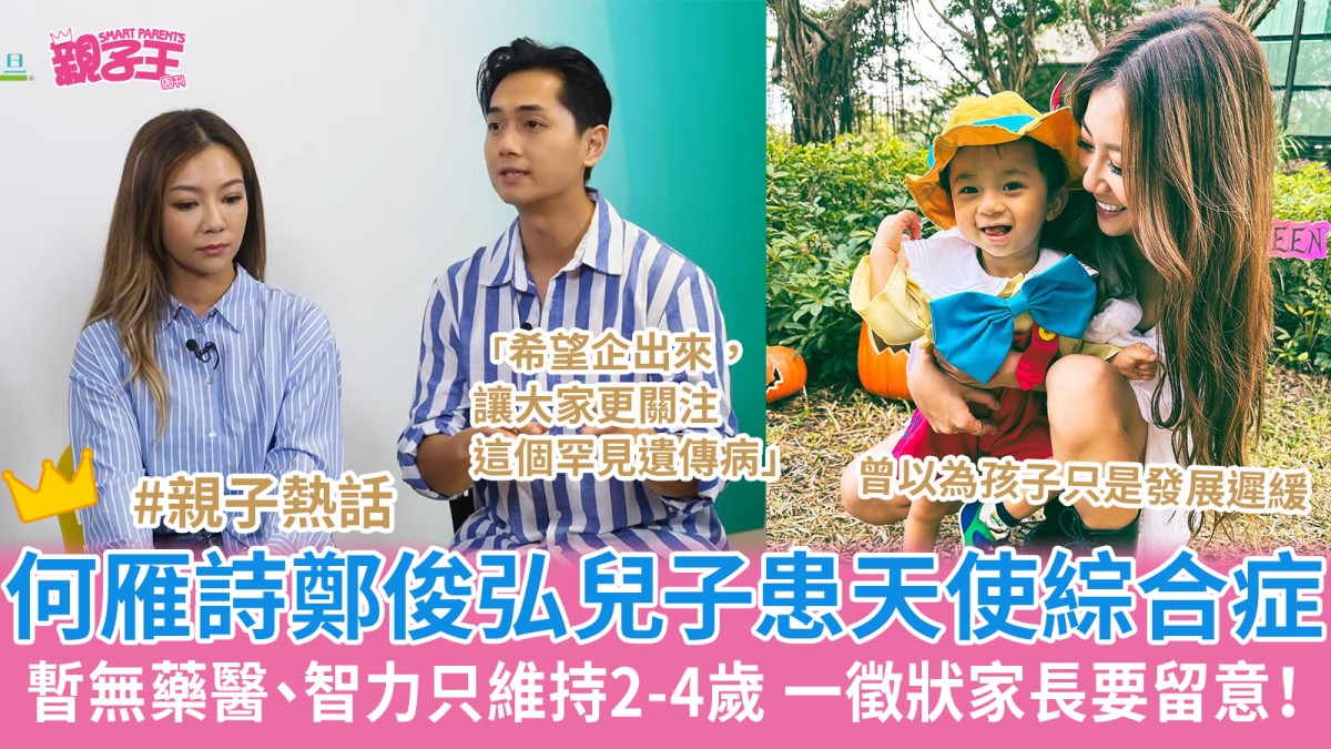 天使綜合症|何雁詩鄭俊弘於2020年結婚,於2022年6月1日誕下兒子鄭讚廷(Asher),組成一家三口的幸福家庭。今日(1日)為Asher 2歲生日,何雁詩鄭俊弘接受鄭丹瑞網上平台節目《健康.旦》訪問時,坦承公開兒子於上年12月30日經專家確診患有罕見遺傳病「天使綜合症」,對於原以為兒子只是發展遲緩,曾跟《親子王》做專訪時表示:「相信有朝一日會追回進度」的新手爸媽來說,坦言心情曾跌入谷底。究竟甚