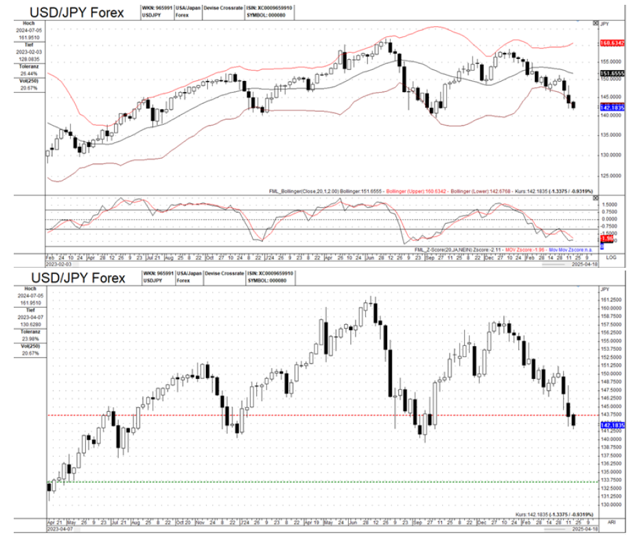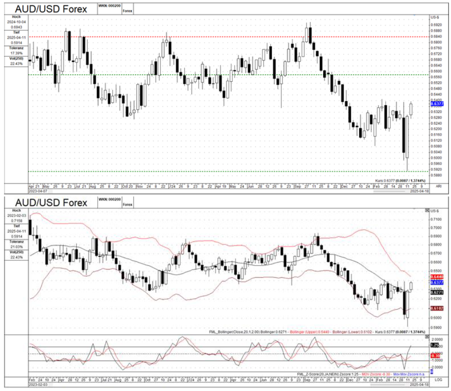 Chart 2 (Bollinger Bands/Z-score): The price has moved below the lower Bollinger Band, indicating a potential oversold condition and heightened volatility. The Z-score is deeply negative, reinforcing the oversold state and suggesting that the recent bearish move is statistically significant.