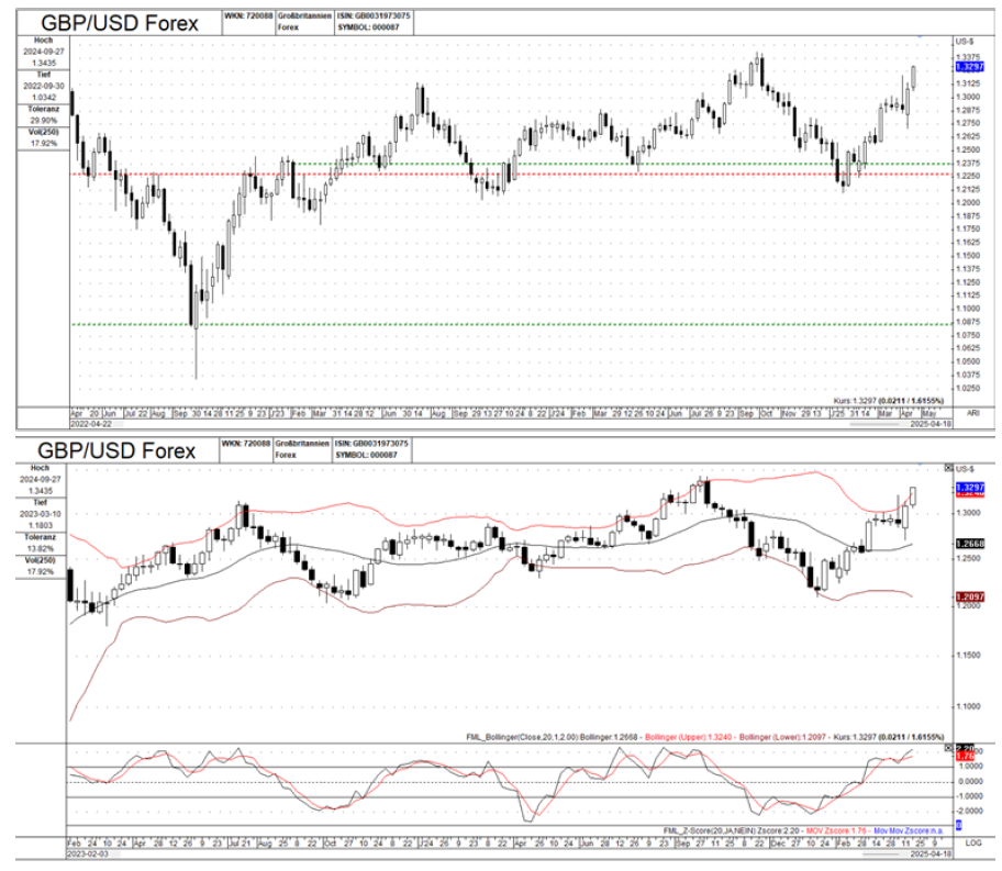 Chart 2 (Bollinger Bands/Z-score): The price is trading above the upper Bollinger Band, indicating overbought conditions. The Z-score is highly positive, reinforcing this overbought state.