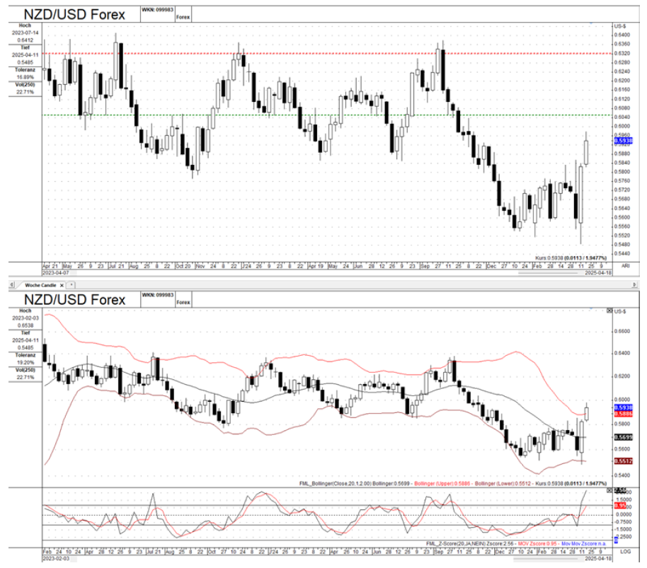 Chart 2 (Bollinger Bands/Z-score): The price is near the lower Bollinger Band, suggesting oversold conditions. The Z-score is negative, supporting this assessment. However, the Bollinger Bands also indicate continued bearish momentum.