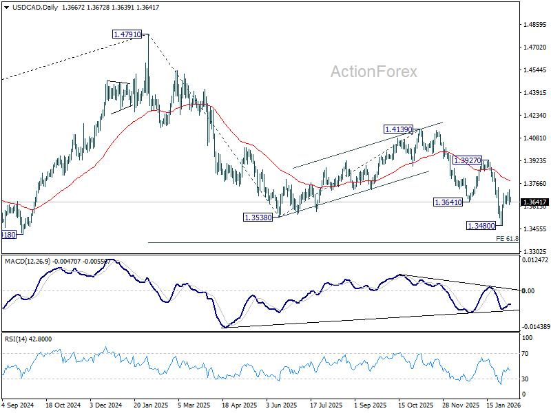 Intraday bias in USD/CAD stays neutral at this point. In case of another rise, upside should be limited by 55 D EMA (now at 1.3781) to complete the corrective bounce from 1.3480. On the downside, break of 1.3625 will bring retest of 1.3480. Firm break there will resume larger down trend from 1.4791 to 61.8% projection of 1.4791 to 1.3538 from 1.4139 at 1.3365.